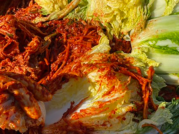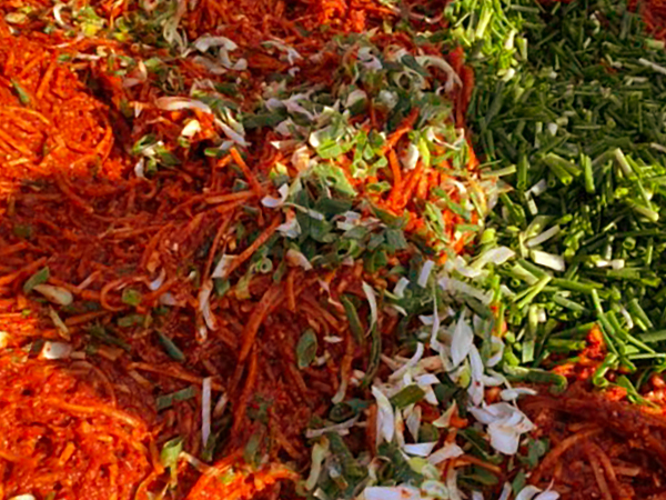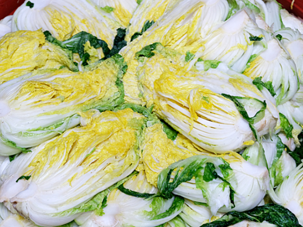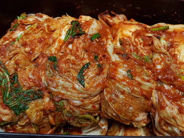 전날 절인 배추를 헹구고 물기로 빼준 뒤 김치 속을 배추 한입씩 골고루 넣어 발라주세요