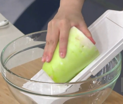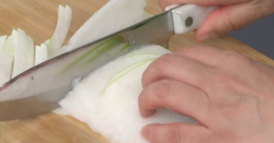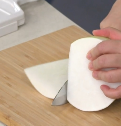 2 등분한 무의 둥근 면 일부를 잘라 줍니다. 잘라 준 면의 무를 슬라이스 칼을 이용하여 결대로 슬라이스 해줍니다. 2~3mm 두께로 잘라 줍니다. 슬라이스 한 무를 결대로 채를 썰어줍니다.
