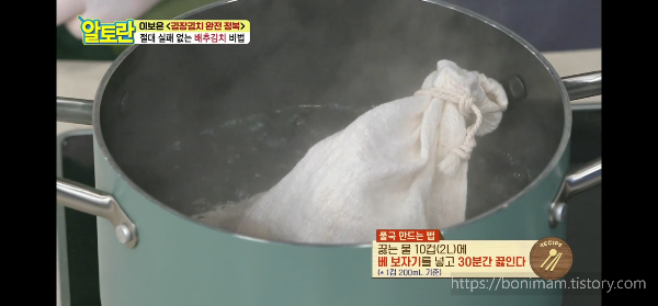 끓는 물 10컵(2ℓ)에 베보자기를 넣고 30분간 끓여줍니다. 육수가 우러나면 베보자기를 건진 후 불을 꺼줍니다.