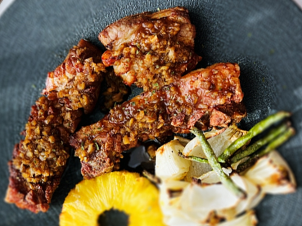 통삼겹살을 스테이크처럼 만든 음식입니다.